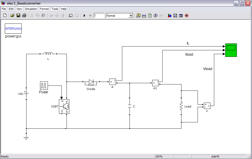 در این قسمت یک مبدل dc به dc بوست Boost شبیه سازی شده است. از مبدل بوست برای تغییر سطح ولتاژ DC استفاده میشود. این مبدل در دو مد کاری پیوسته و ناپیوسته کار می کند. این مبدل یک مبدل افزاینده ولتاژ می باشد ، که با تنظیم duty cycle پالس زنراتور می توانیم ولتاژ DC را تغییر دهیم