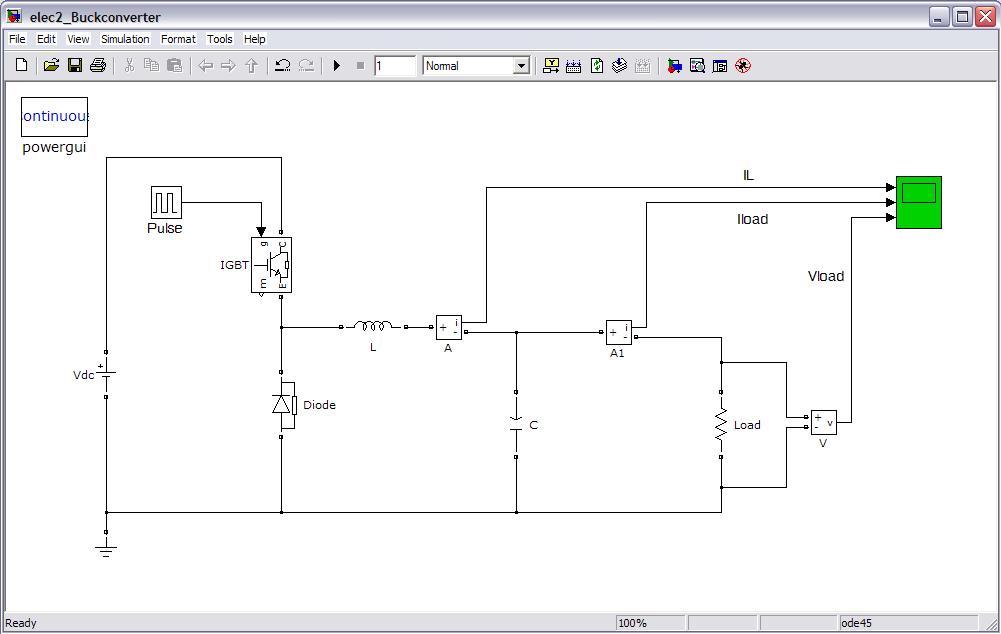 در این قسمت یک مبدل dc به dc باک شبیه سازی شده است. از مبدل باک برای تغییر سطح ولتاژ DC استفاده میشود. این مبدل در دو مد کاری پیوسته و ناپیوسته کار می کند. این مبدل یک مبدل کاهنده ولتاژ می باشد. که با تنظیم duty cycle پالس زنراتور می توانیم ولتاژ DC را تغییر دهیم
