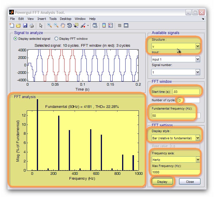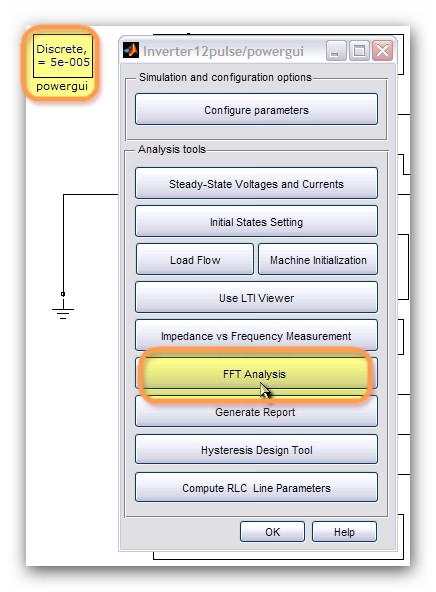 حال یک بار دیگر پروژه را Run می کنیم . پس از این کار بر روی power gui دبل کلیک کرده تا پنجره زیر ظاهر گردد. و در نهایت بر روی FFT Analysis کلیک کرده تا وارد محیط آنالیز FFT شویم.
