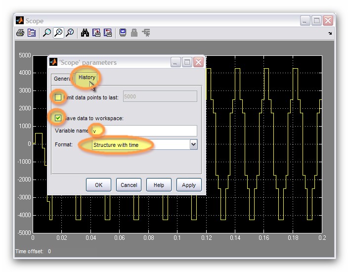 Limit data points to last را غیر فعال می کنیم. Save data to workspace را فعال کرده و فرمت structure with time را از منوی کشویی انتخاب می کنیم.